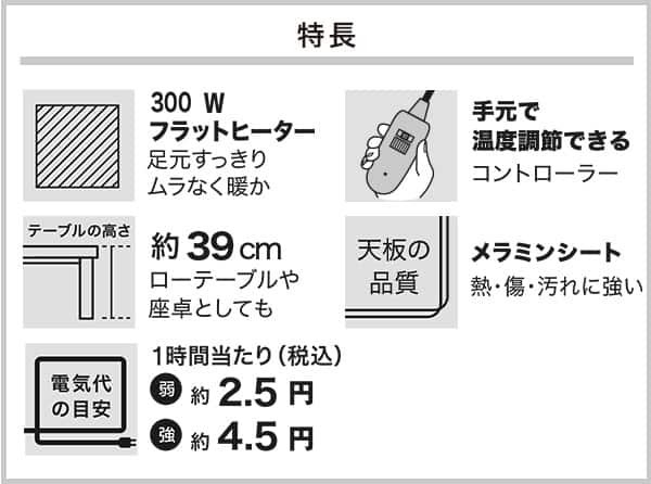 幅75×奥行75×高さ34cmのこたつに厚さ5cmのふとんを掛け、人が入らない状態で5時間運転させた時の値です。