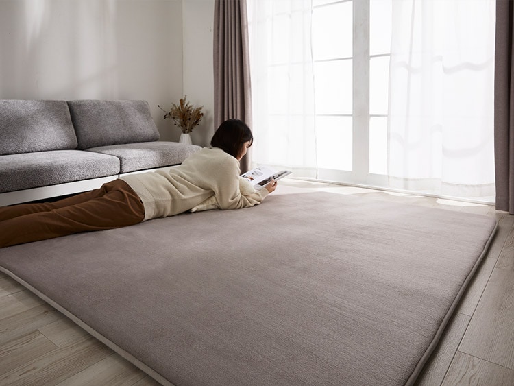 寒い時期にうれしい床暖使用可能。裏生地は滑り止め加工でズレにくい。※画像は185×185cmを使用しています。