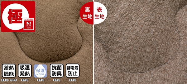 吸湿発熱生地に抗菌防臭、静電気防止機能つき。