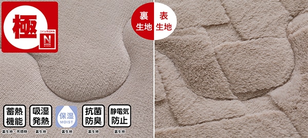 吸湿発熱生地に抗菌防臭、静電気防止機能つき。