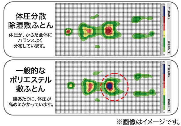 ※色が濃い青に近い部分は、体圧が高めにかかっています。(圧力分布測定装置によるデータ)