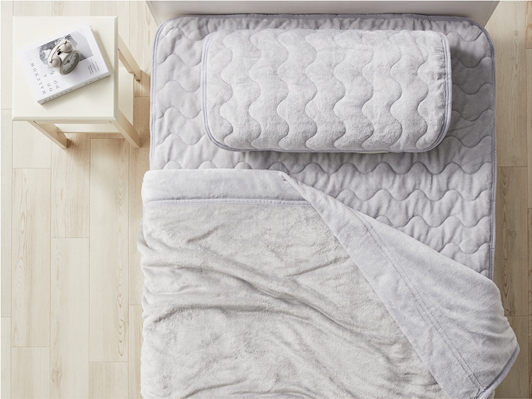 2枚合わせ毛布でふとんの熱を逃しにくく、襟元もボリュームがありさらにぬくぬくあったか♪