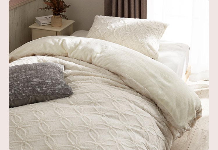 ラビットファーであたたかく。ふとんを入れずに毛布としても使える。