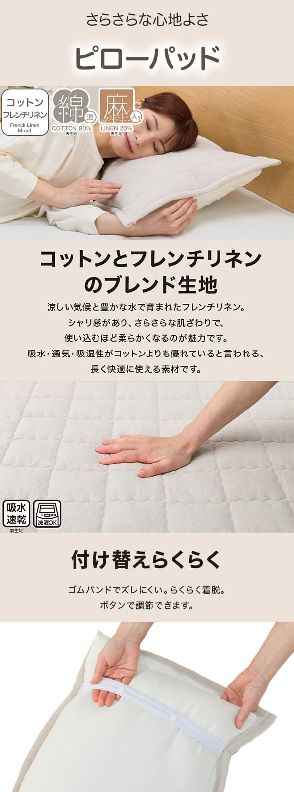 コットンとフレンチリネンをブレンドした生地で、さらさらな心地よさ。