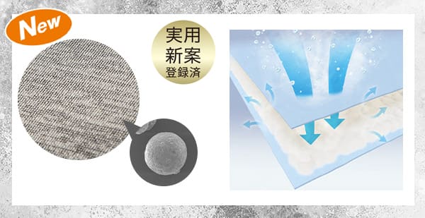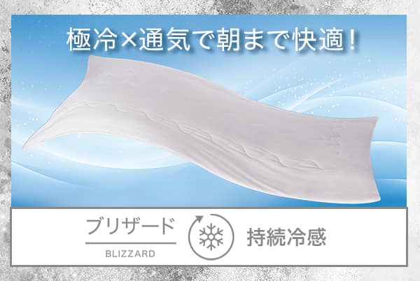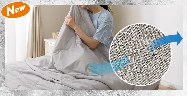 持続冷感素材を練り込んだ生地で冷たさ長続き。除湿わたが湿気を吸放湿してムレにくい。