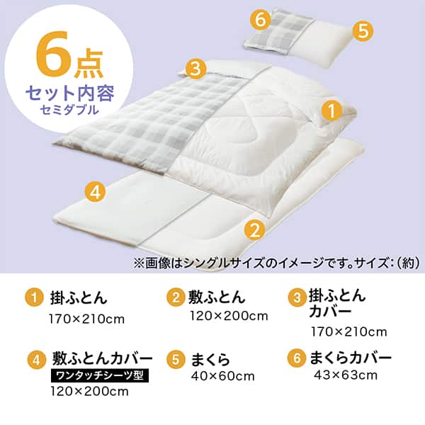 カバー付き 布団セット 6点 (S2601 セミダブル グレーチェック)