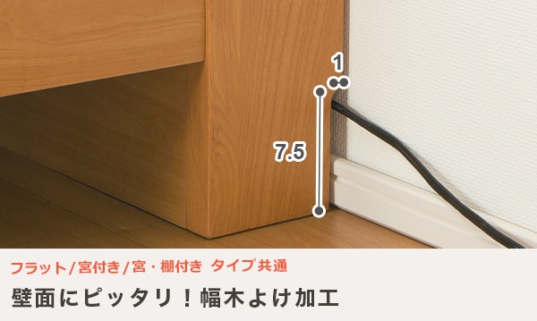 ヘッドボード側板には幅木のある壁面に隙間なく設置できます。また、隙間からコードを通すこともできます。