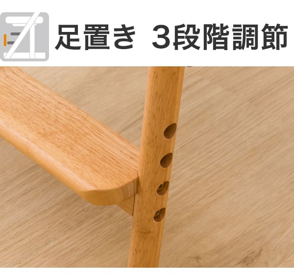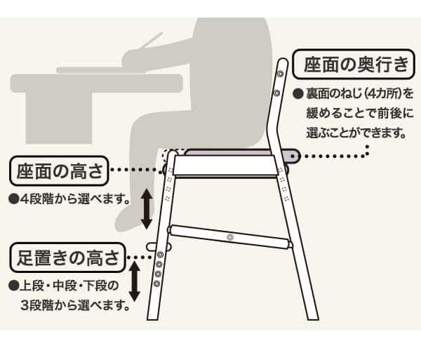 お子様の成長に合わせて高さ調節が可能。奥行き・高さ・足置きの3ポイントで調節できます。