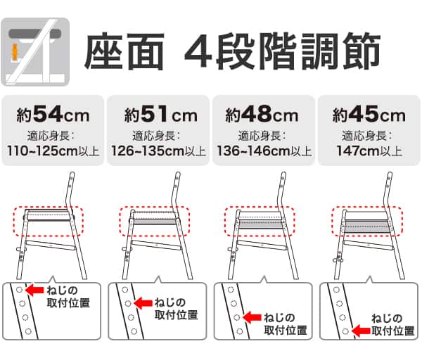 座面が4段階に調整可能な為、お子様の成長に合わせてお使いいただけます。
