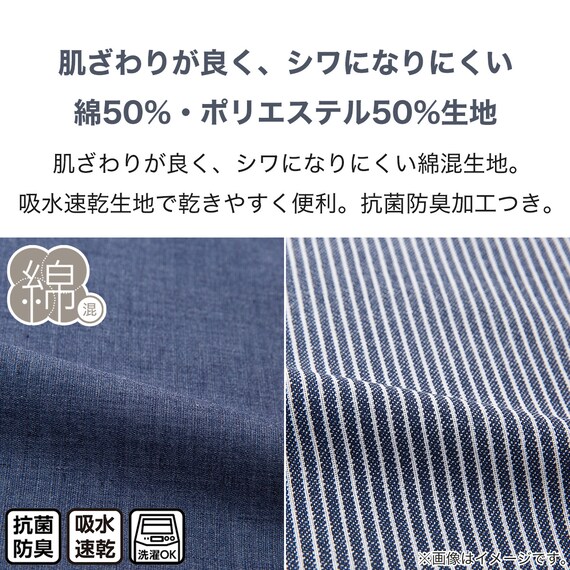 肌ざわりが良く、シワになりにくい綿混生地。吸水速乾生地で乾きやすく便利。抗菌防臭加工つき。