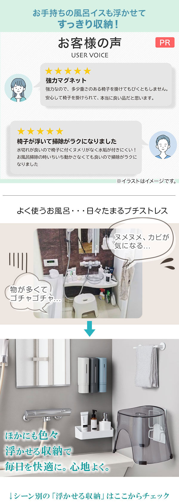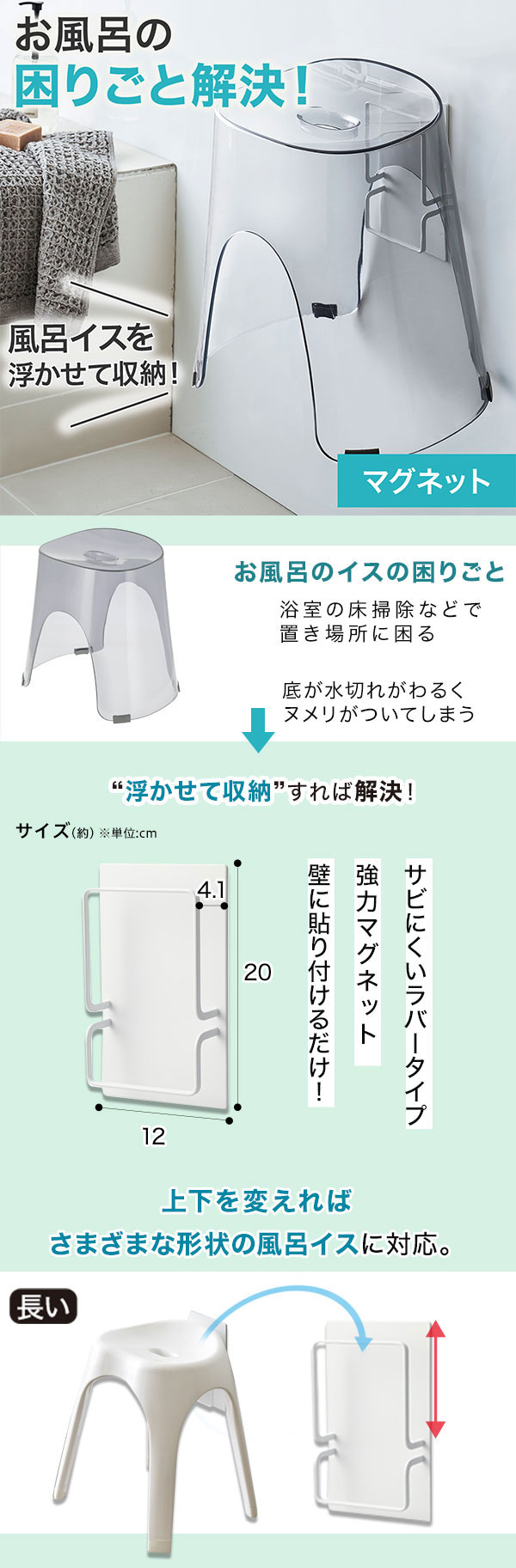 ●浴室の床掃除などで置き場所に困る風呂椅子が強力マグネットで壁面に収納可能